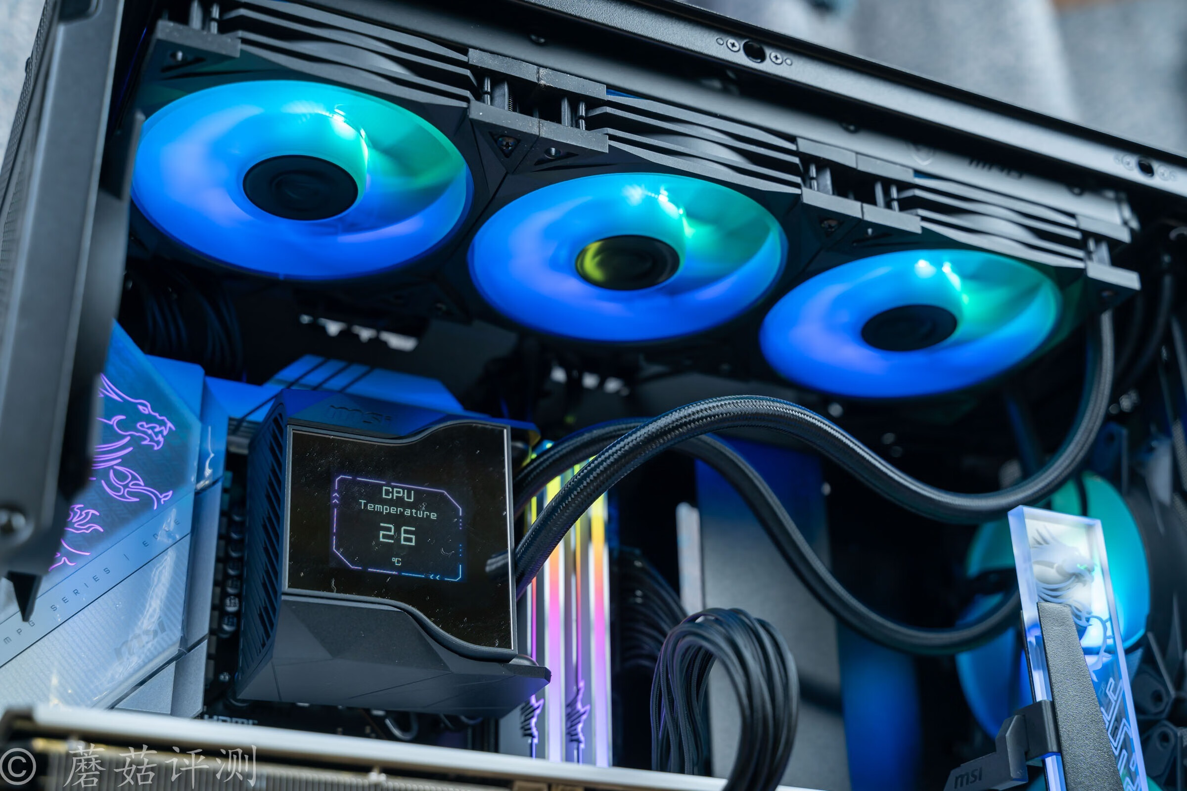 ▼這款水冷用的是Asetek的第七代方案,水冷排的冷排風扇是微星的刀鋒6代風扇,讓這款水冷的散熱水平表現非常出色,面對額定功耗280W的14700K處理器,可以輕松壓制。水冷排風扇還支持ARGB燈效、支持主板同步,風扇的扇葉是乳白色的,柔光效果很棒。