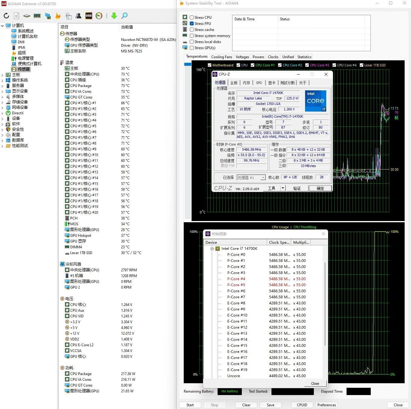 ▼跑個CPU-Z的壓力測試,處理器功耗在220W左右,大核心睿頻5.5GHz,小核心睿頻4.3GHz,處理器溫度在73℃左右波動。