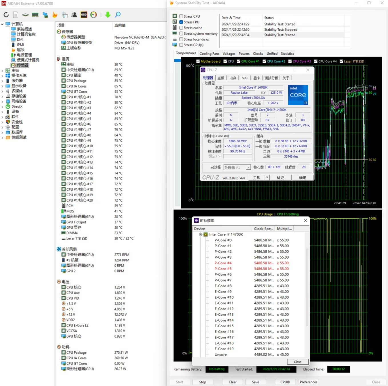 ▼單烤FPU測試,處理器功耗去到了275W左右,大核心睿頻5.5GHz、小核心睿頻4.3GHz,溫度在85℃左右,表現不錯。