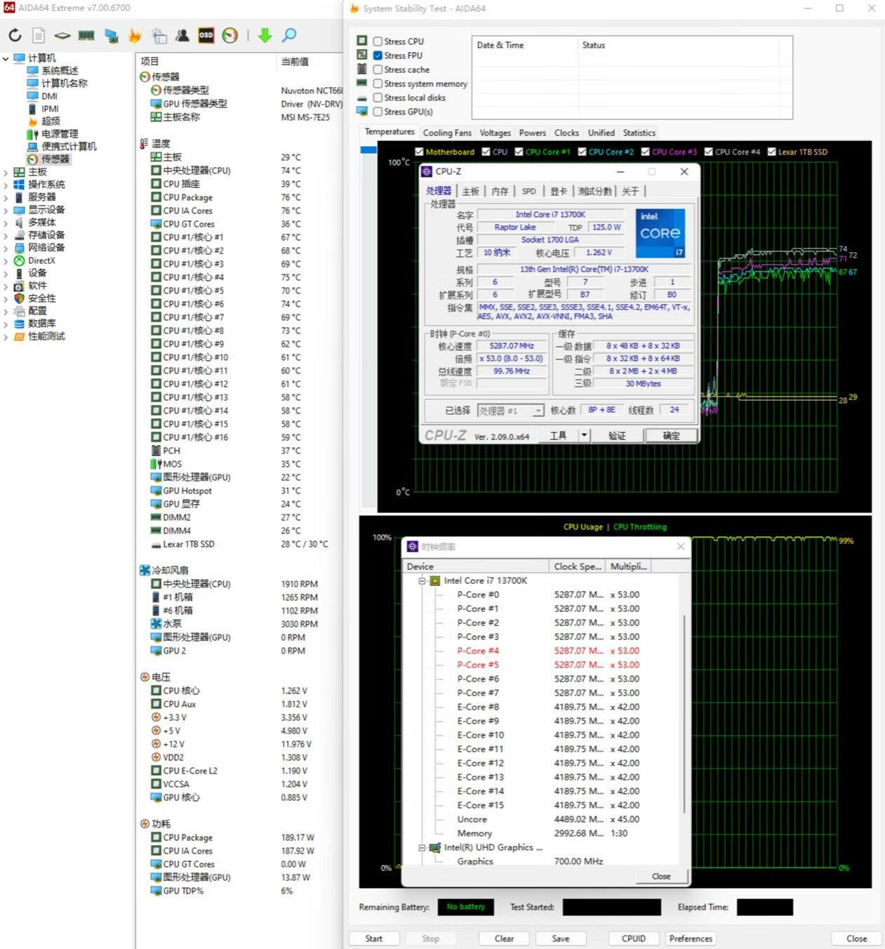 ▼簡單跑個CPU-Z的壓力測試,處理器功耗在190W左右,大核心睿頻5.3GHz、小核心睿頻4.2GHz,溫度在74℃左右,散熱表現不錯。