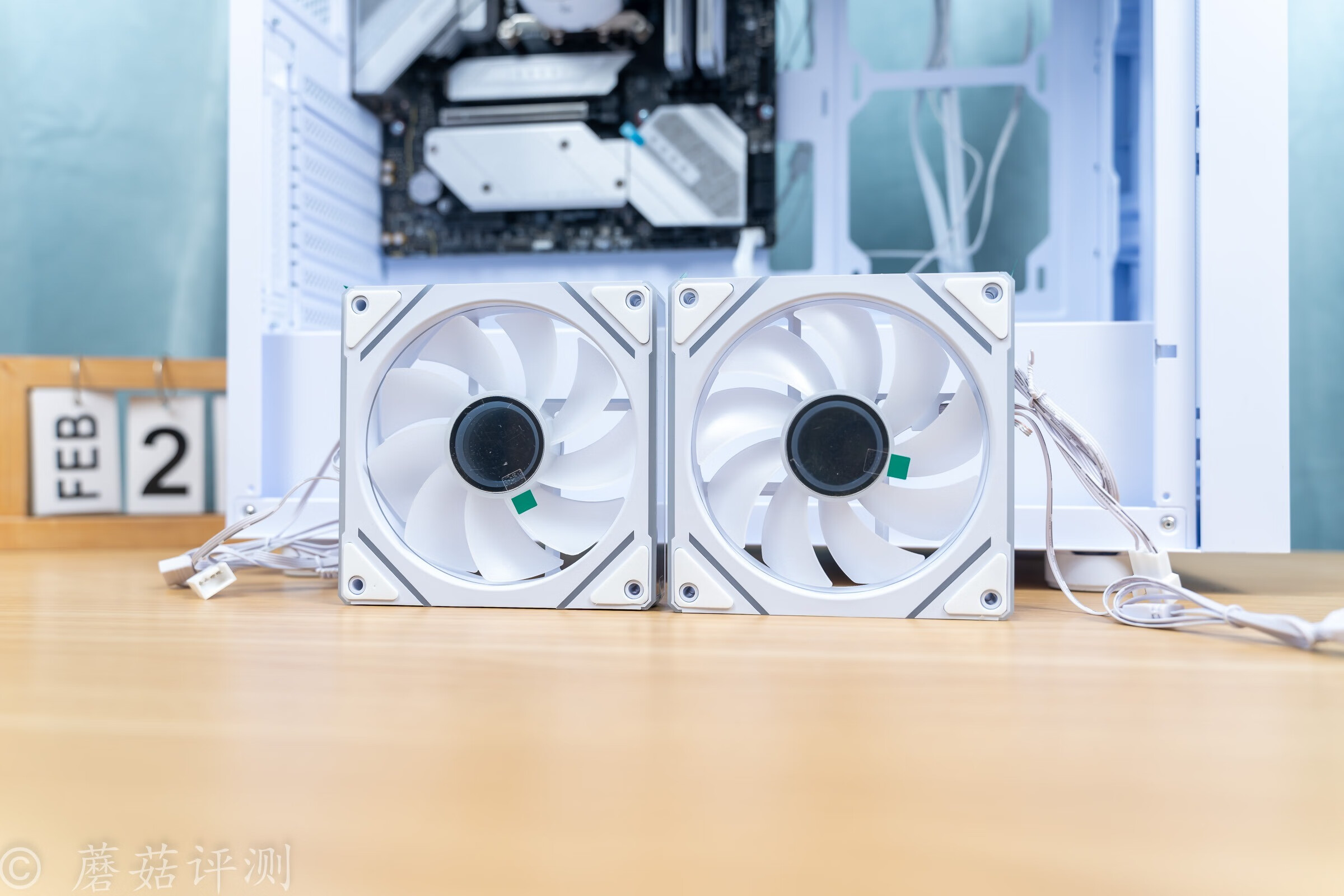 ▼水冷排的冷排風扇扇葉也是乳白色的,柔光效果非常不錯,支持ARGB燈效,支持主板同步。
