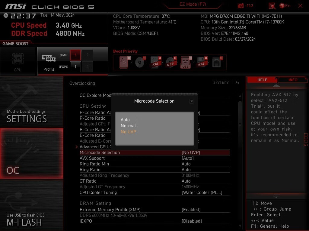 ▼在主板的BIOS中,選擇“No UVP”,也就是微星的B760主板的104微碼選項。